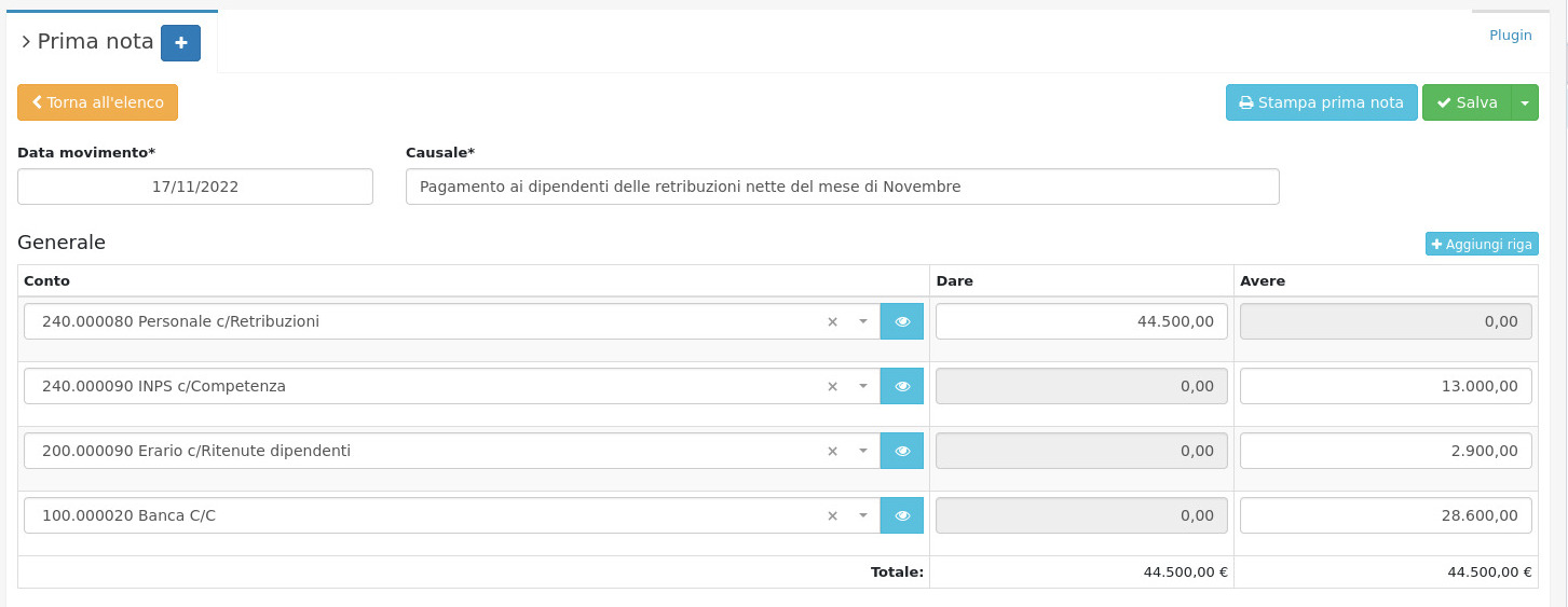 In questo modo nel Conto Economico e nello Stato Patrimoniale figureranno rispettivamente Costi e Passività pari all'importo dei salari e stipendi versati