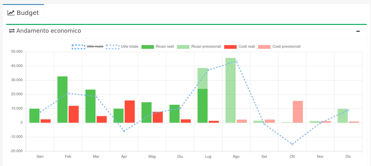 A seguito dell'installazione del modulo, cliccando su Budget apparirà il seguente prospetto che evidenzia l'Utile totale, dato dalla differenza tra ricavi e costi totali.