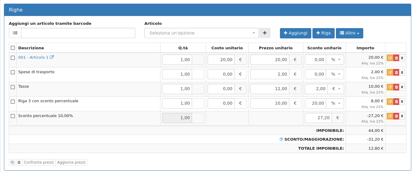 Questa sezione permette di inserire le righe descrittive dell'attività, che possono essere:
