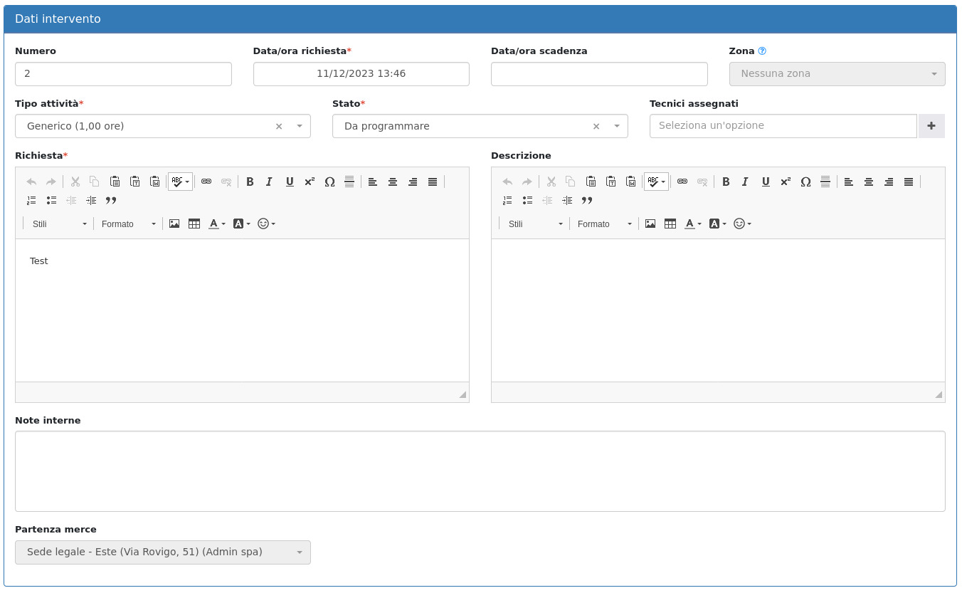 Una volta aperta la schermata di dettaglio, sarà possibile completare l'attività in tutti i campi supportati. La sezione di modifica è suddivisa in 6 sezioni: