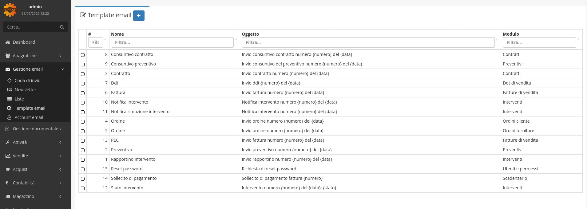 Il modulo Template email permette all’azienda di gestire le informazioni di base riguardanti i contenuti e le caratteristiche delle email che OpenSTAManager può eventualmente procedere a inviare.
