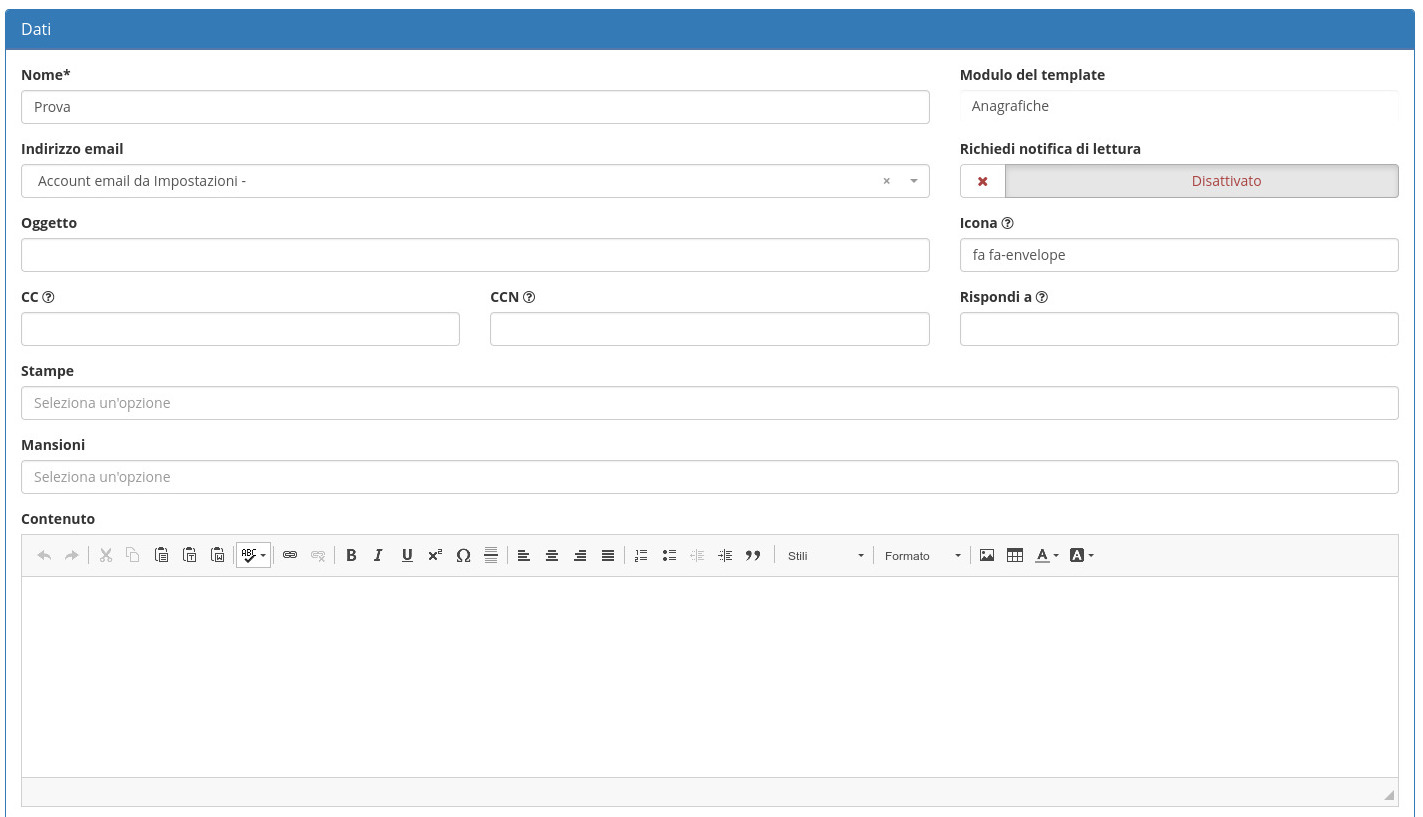 Tra questi campi, Contenuto e Oggetto prevedono un sistema di autocompletamento per alcuni particolari valori definiti dal modulo. L'elenco completo di questi elementi viene reso disponibile nella sezione informativa Variabili.