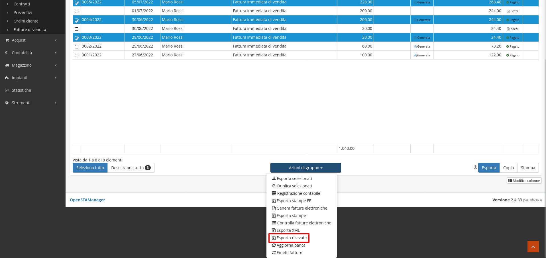 Una volta selezionati i record interessati è possibile esportare massivamente le ricevute cliccando su Azioni di gruppo/Esporta ricevute.
