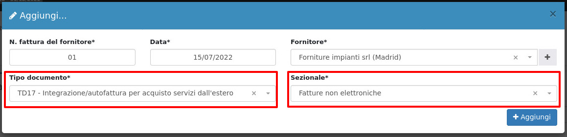 Una volta compilato il form si dovrà cliccare su Aggiungi, andare a selezionare la modalità di pagamento e procedere all'inserimento delle righe, per cui andrà selezionata una categoria IVA Non Imponibile.
