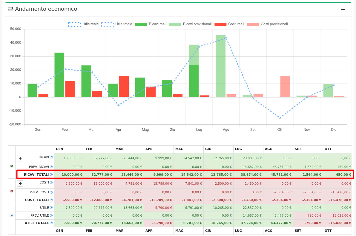 Ponendo l'attenzione sui ricavi si può notare che i ricavi reali sono composti dalla somma delle fatture di vendita già contabilizzate, mentre i ricavi totali sono formati dalla somma di questi e i ricavi previsti da previsionali o sergenti dati esterne.