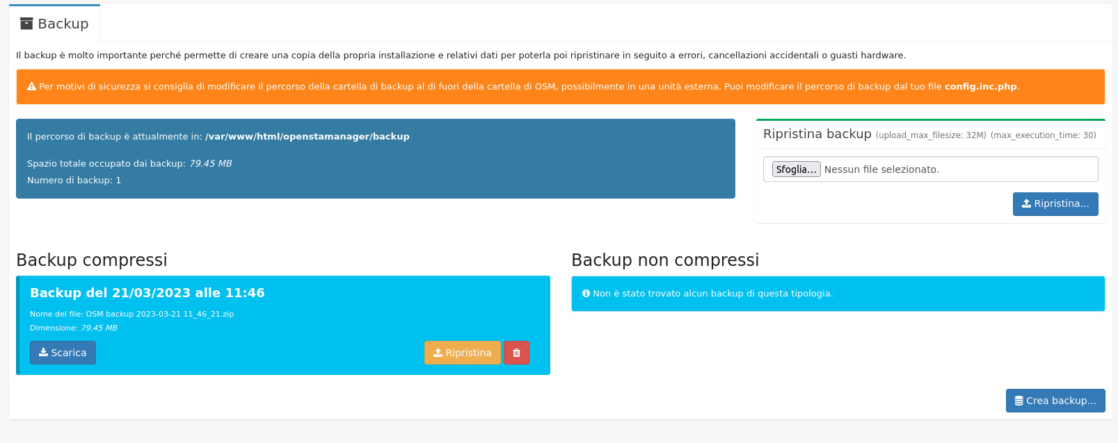 $backup_dir = __DIR__.'/backup/';Per motivi di sicurezza si consiglia di modificare il percorso della cartella di backup al di fuori della cartella di OSM, possibilmente in una unità esterna.
