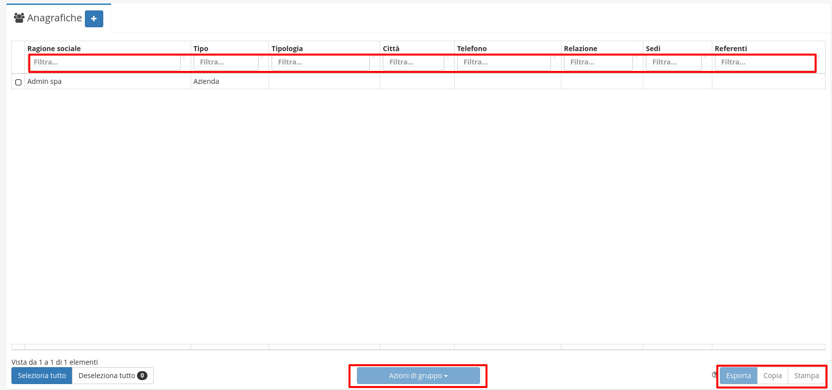 La schermata principale che si apre entrando in un modulo è formata da una tabella che permette una serie di operazioni comuni su tutti gli elementi registrati all'interno del modulo: