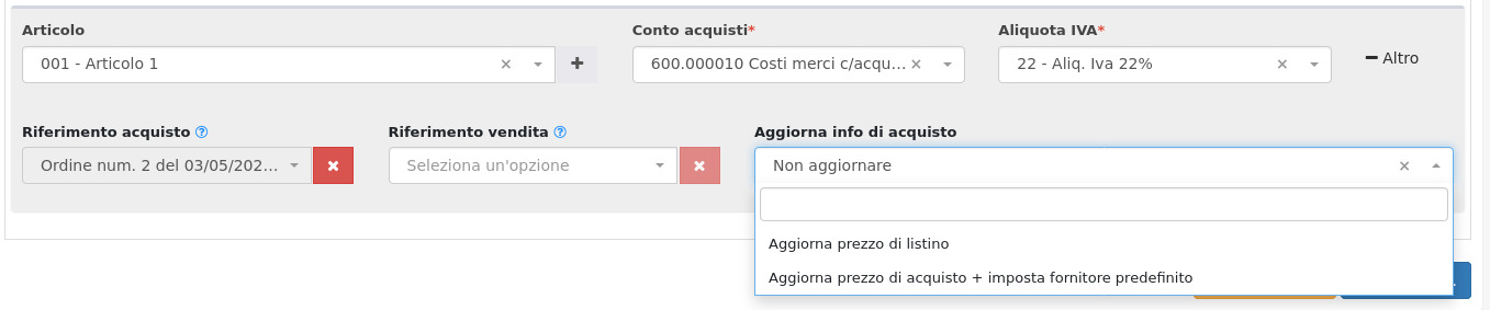 Se Aggiornare il prezzo di acquisto presente a magazzino e il relativo listino fornitore o se non apportare modifiche alla scheda articolo.