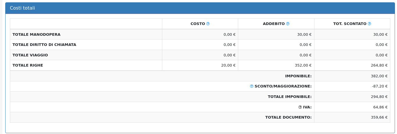 In questa sezione viene viene visualizzata una tabella riassuntiva di tutti i costi inerenti all'attività.