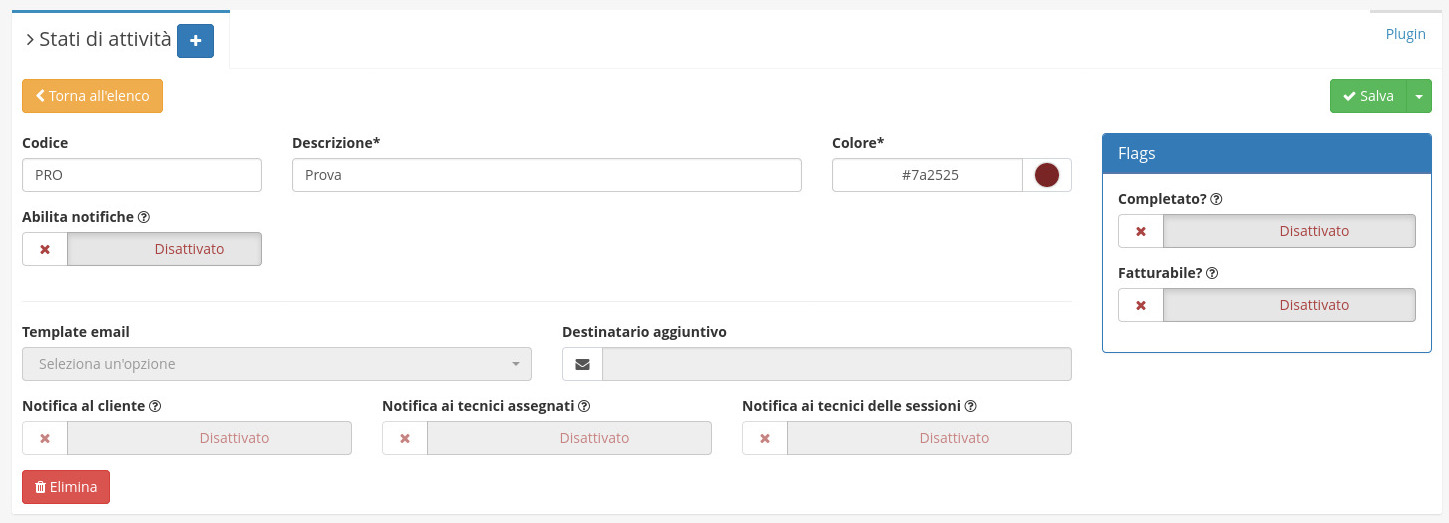 Il modulo Stati di attività offre di base 4 stati, assegnabili ad un tecnico,quali: