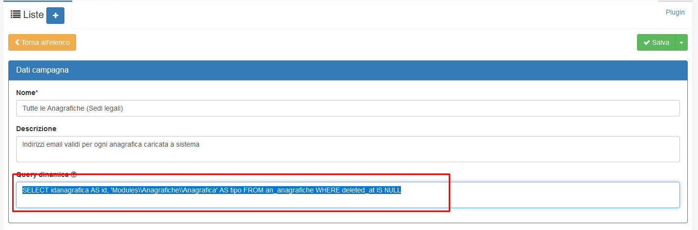 Query dinamica: L'utilizzo di questo campo esclude la possibilità di inserire i destinatari tramite il menù a tendina "Destinatari" presente nella sezione Aggiunta destinatari. Le informazioni inserite in questo campo devono essere scritte con il linguaggio sql; Esempio: "SELECT idanagrafica AS id, 'Modules\Anagrafiche\Anagrafica' AS tipo FROM an_anagrafiche WHERE deleted_at IS NULL" aggiungerà tutte le anagrafiche nella tabella Destinatari.