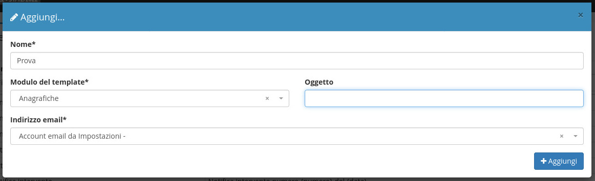Per creare un nuovo template email si dovrà cliccare sul tasto (+) e inserire il Nome, Modulo a cui applicarlo, Oggetto e indirizzo email da cui inviare la mail.