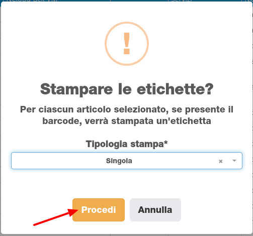 Il gestionale chiederà ora se procedere alla stampa singola o in formato A4 delle etichette.