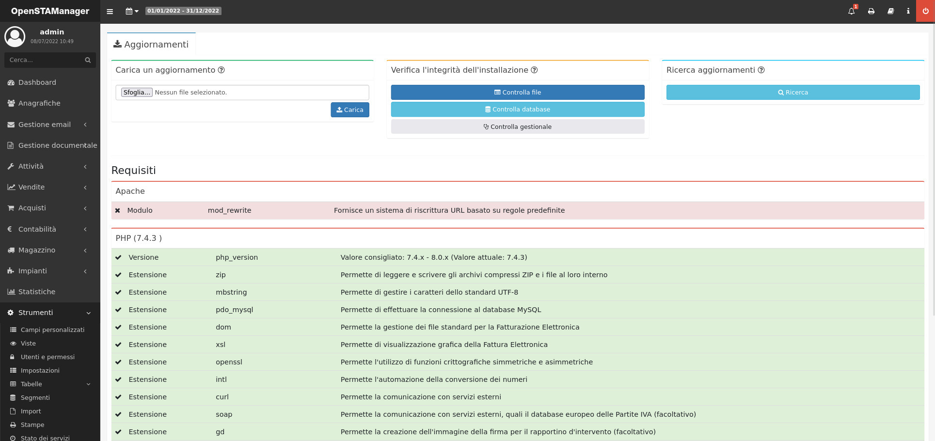 Questa sezione mostra che requisiti per il corretto funzionamento di OpenSTAManager vengono soddisfatti e quali no.