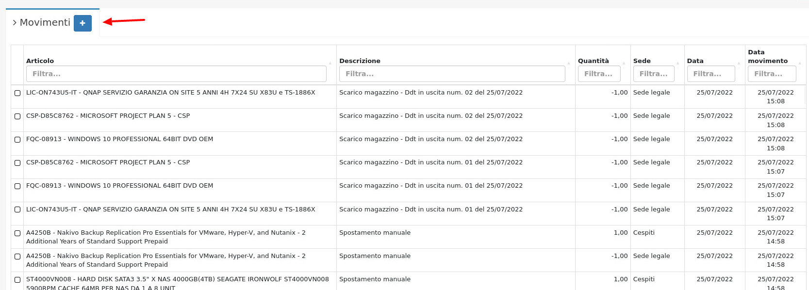 E' possibile spostare un articolo di magazzino da una sede all'altra dal modulo Magazzino/Movimenti, cliccando sul tasto (+) per creare un nuovo movimento.