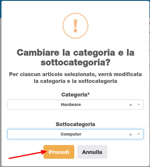 Il gestionale chiederà quindi le nuove categoria e sottocategoria da applicare.
