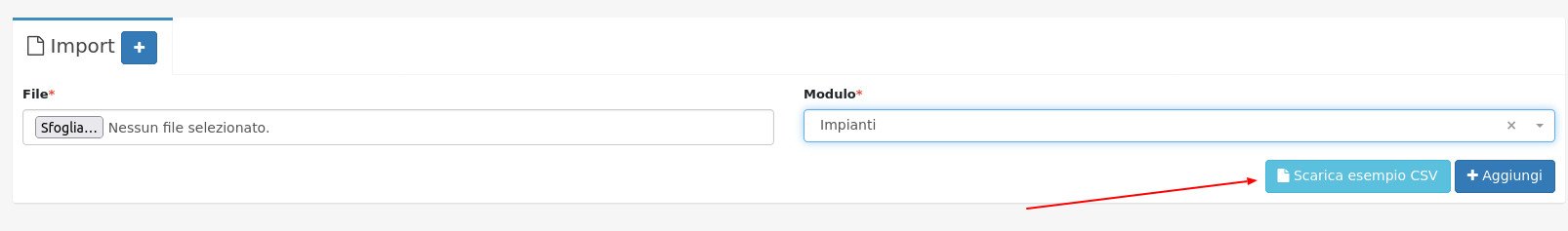 Accedere dal menù di OpenSTAManager al modulo Strumenti/Import e impostare Impianti nel menù a tendina, dopo aver selezionato il modulo sarà visibile un nuovo pulsante nella schermata "Scarica esempio CSV".