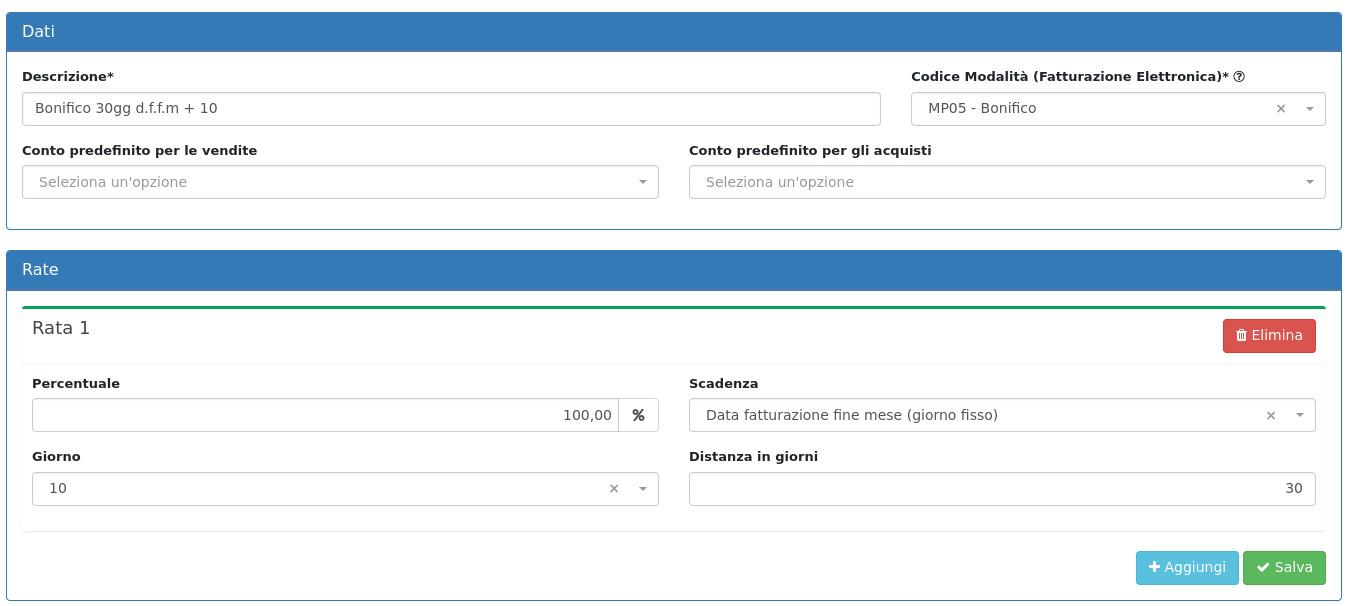 Volendo aggiungere alle modalità di pagamento il Bonifico 30gg d.f.f.m + 10 si dovrà aggiungere un nuovo tipo di pagamento che riporterà una rata del 100% dell'importo complessivo, a 30 giorni dalla data di emissione della fattura (da specificare nel campo Distanza in giorni).