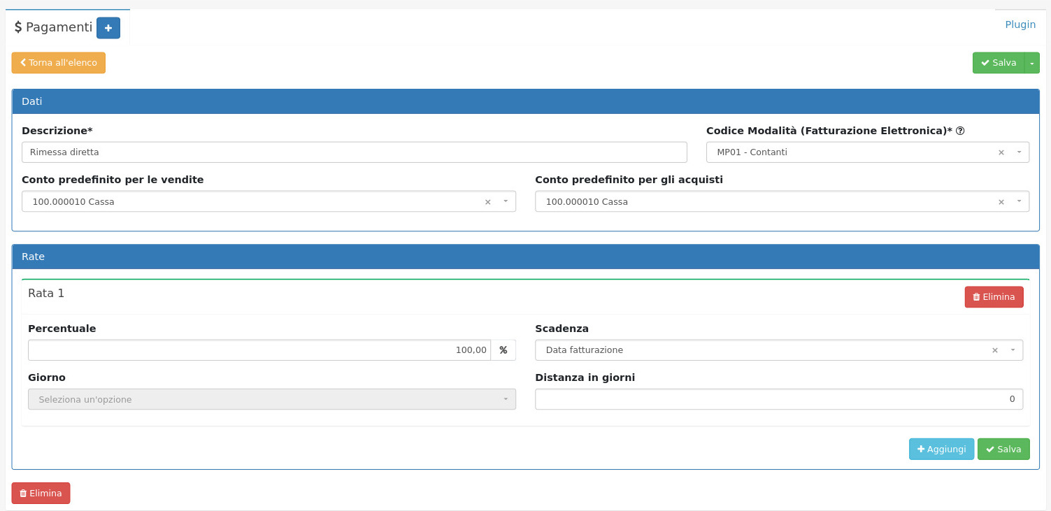 Per creare un nuovo tipo di pagamento si dovrà cliccare sul tasto (+).