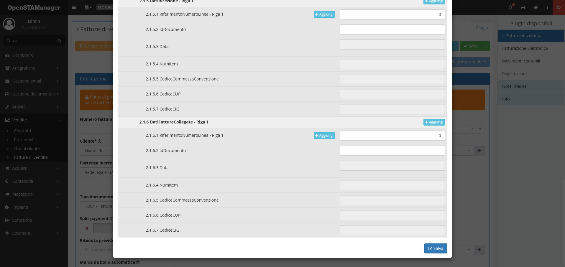 Sarà qui possibile andare a modificare i dati da inserire in fattura elettronica in formato XML.