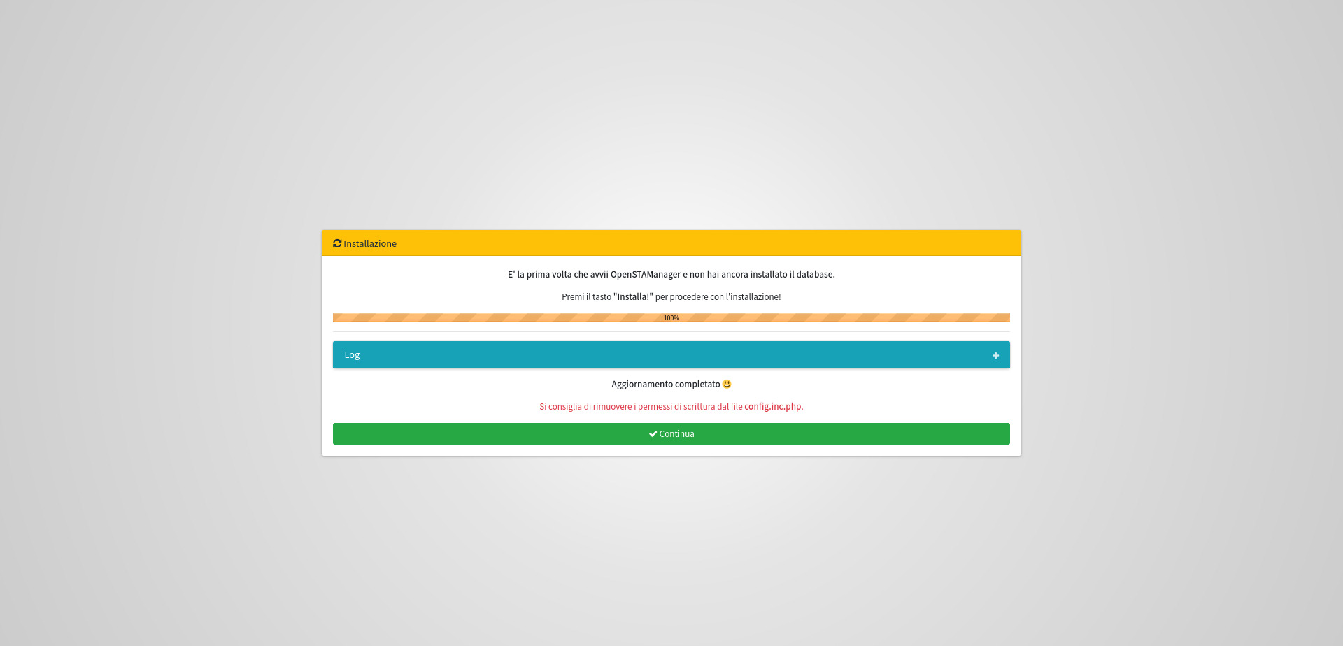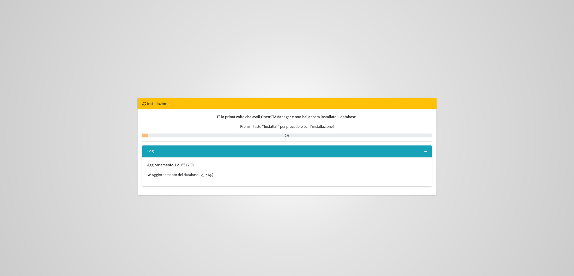 Una volta inseriti correttamente i parametri di configurazione, è sufficiente cliccare sul pulsante per avviare l'installazione del database di OpenSTAManager.