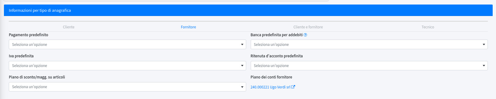 In questa sezione si possono impostare dei valori predefiniti in base al tipo di anagrafica: