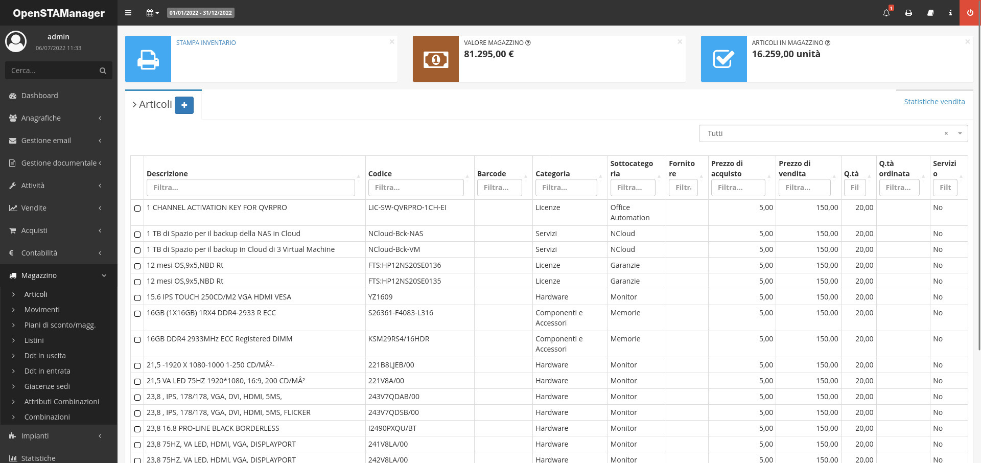 Il modulo Articoli permette all’azienda di gestire le informazioni riguardanti gli articoli a magazzino, con la relativa giacenza e la gestione automatizzata dei diversi movimenti previsti all'interno di OpenSTAManager.