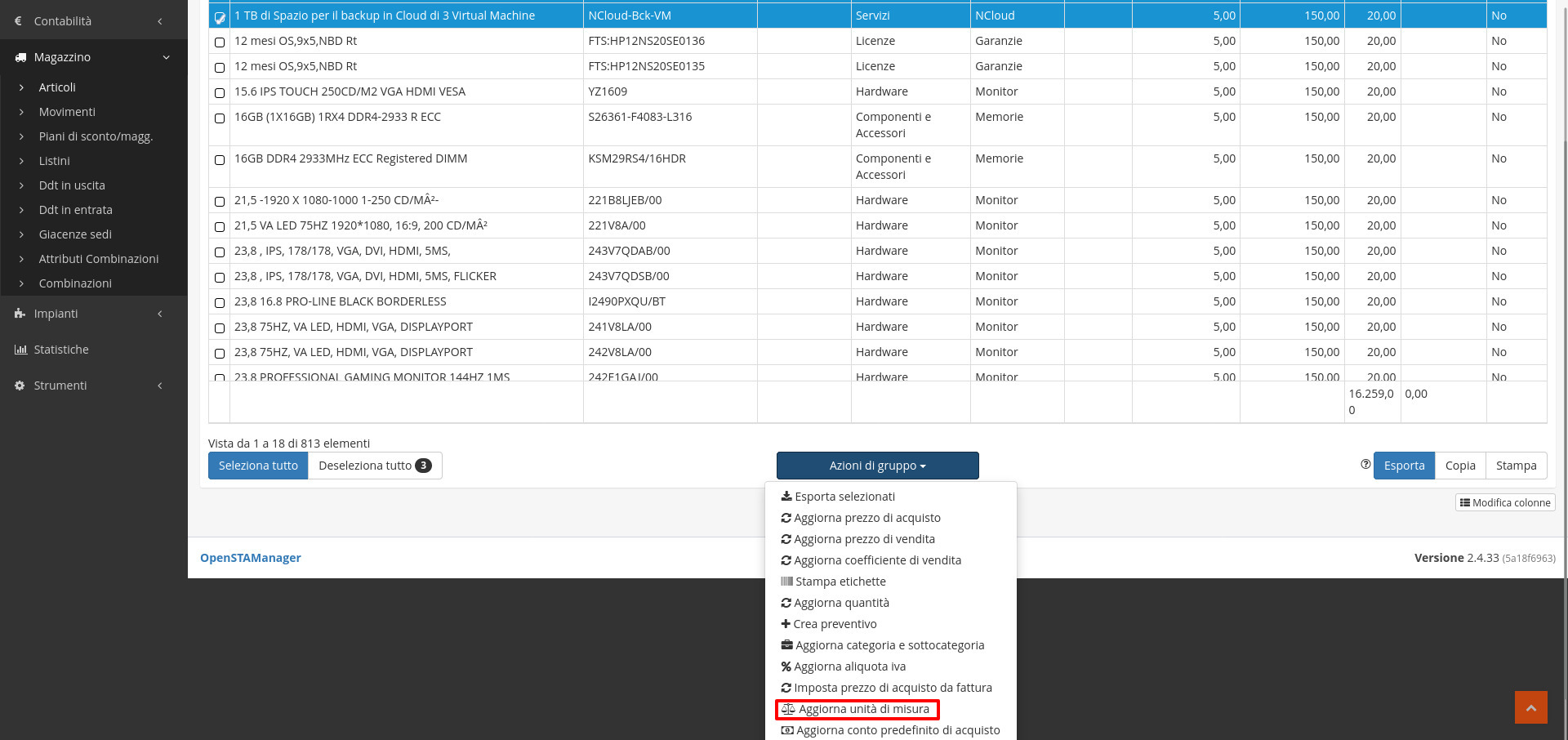 Una volta selezionati i record interessati è possibile modificarne massivamente l'unità di misura cliccando su Azioni di gruppo/Aggiorna unità di misura.