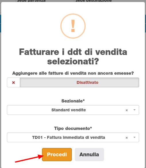 Il gestionale chiederà quindi la conferma a procedere alla fatturazione, permettendo di scegliere: