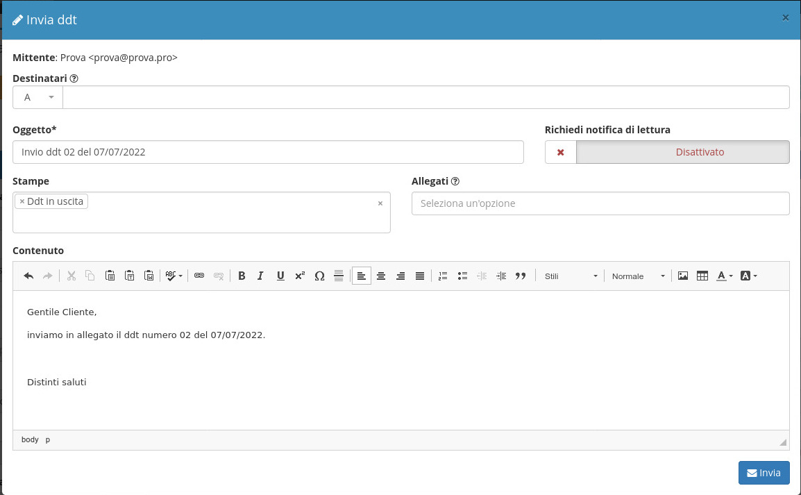 Si verrà quindi indirizzati al template email compilato con i dati del DDT, dove sarà possibile procedere all'invio cliccando su Invia.