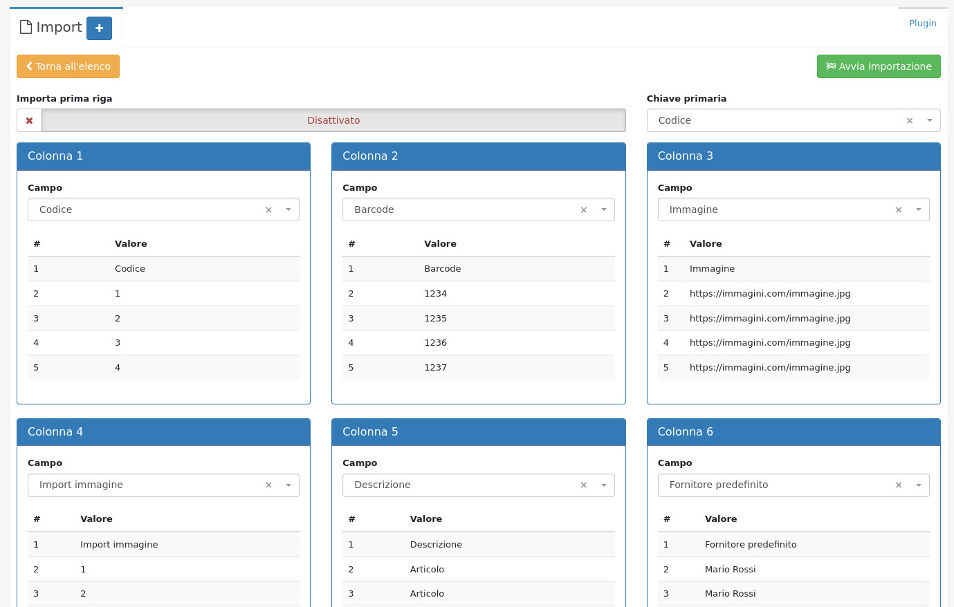 Da questa schermata sarà ora possibile procedere a mappare i campi del CSV con quelli del gestionale, impostare la chiave primaria e cliccare su Avvia importazione.