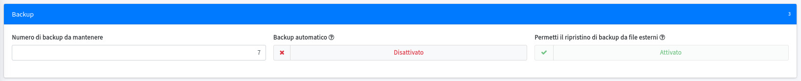 Il backup presenta alcune impostazioni configurabili dall'utilizzatore in relazione alle operazioni di backup automatico e al percorso di salvataggio dei backup stessi.