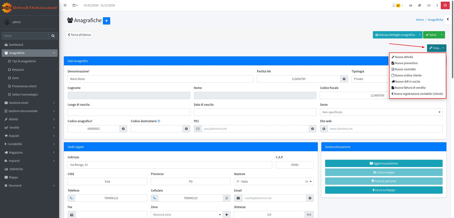 Dalla schermata di dettaglio di un'anagrafica è possibile procedere alla creazione di documenti collegati ad essa: