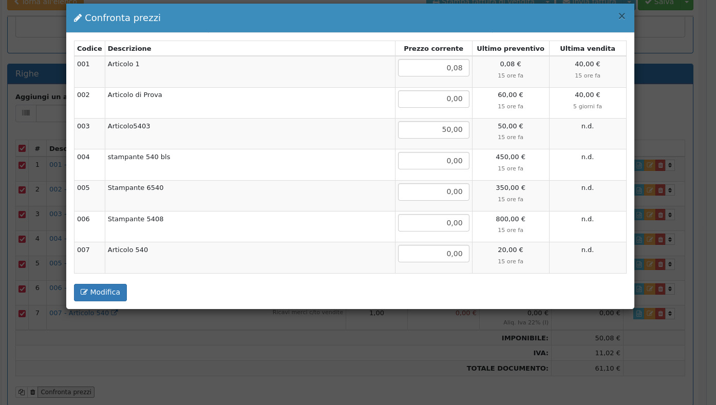 Da qui è possibile modificare il prezzo di vendita massivamente apportando le dovute correzioni e cliccando su **Modifica**.
