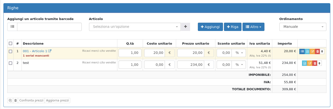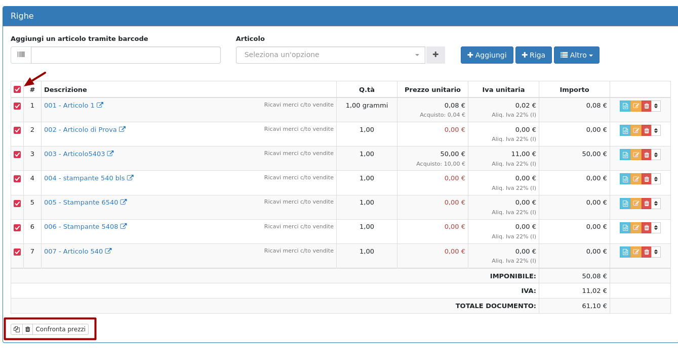 E' possibile intervenire massivamente sulle righe dei documenti selezionandole e ricorrendo alle azioni di gruppo: