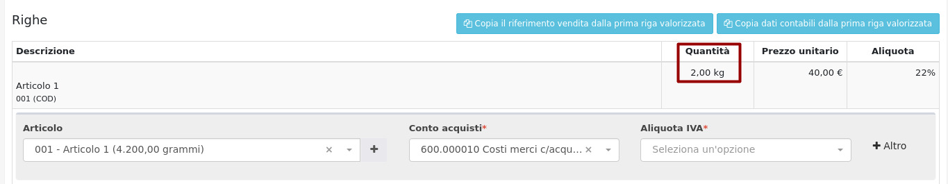 Nel caso in cui nella scheda articolo sia impostata un'unità di misura secondaria con il corrispondente fattore moltiplicativo, in questa schermata verrà visualizzata l'unità di misura secondaria. L'articolo verrà invece caricato a magazzino per la corretta quantità e unità di misura primaria stabilite nella scheda articolo.