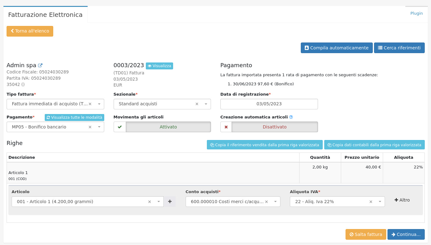 Con questo plugin è possibile importare nel gestionale le fatture elettroniche di acquisto scaricandole dal proprio cassetto fiscale. Le fatture da importare vengono visualizzate nella sezione inferiore della pagina, e tramite Importa in sequenza è possibile importarle massivamente.