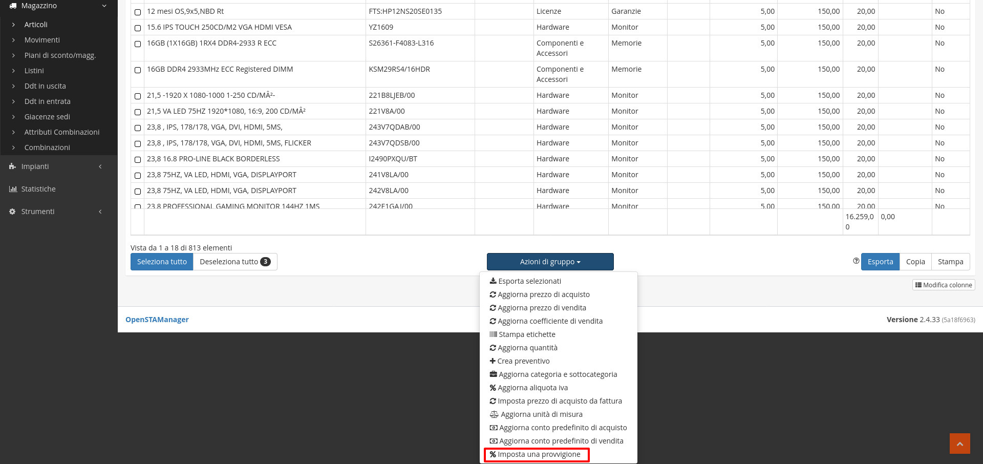 Il modulo Articoli permette di svolgere diverse azioni massivamente dalle azioni di gruppo: