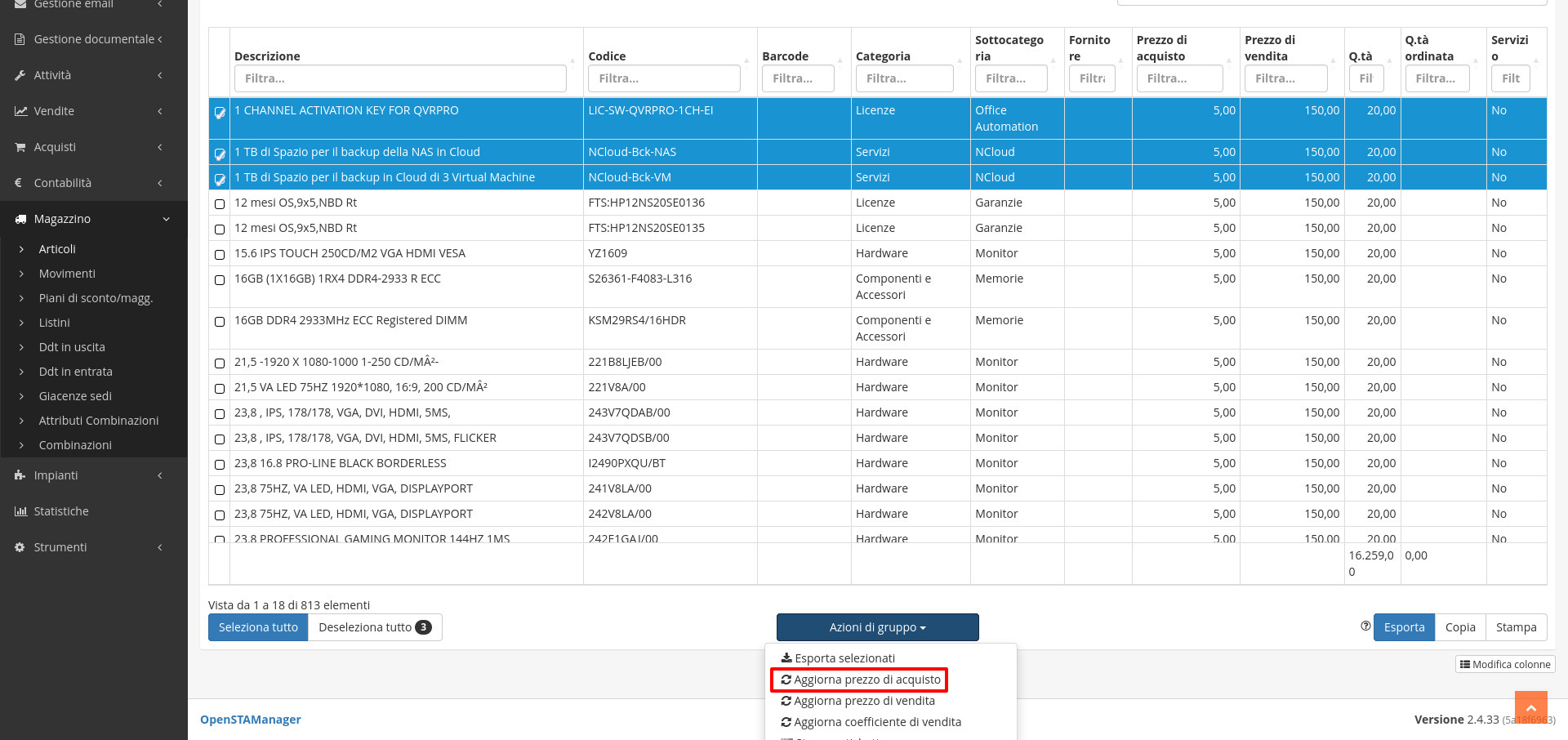 Una volta selezionati i record interessati è possibile aggiornare massivamente le loro quantità cliccando su Azioni di gruppo/Aggiorna quantità