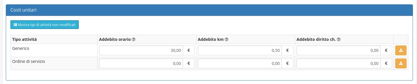 Scorrendo alla scheda Costi unitari sarà possibile andare a specificare i costi fissi di chiamata e quelli relativi ai tecnici.