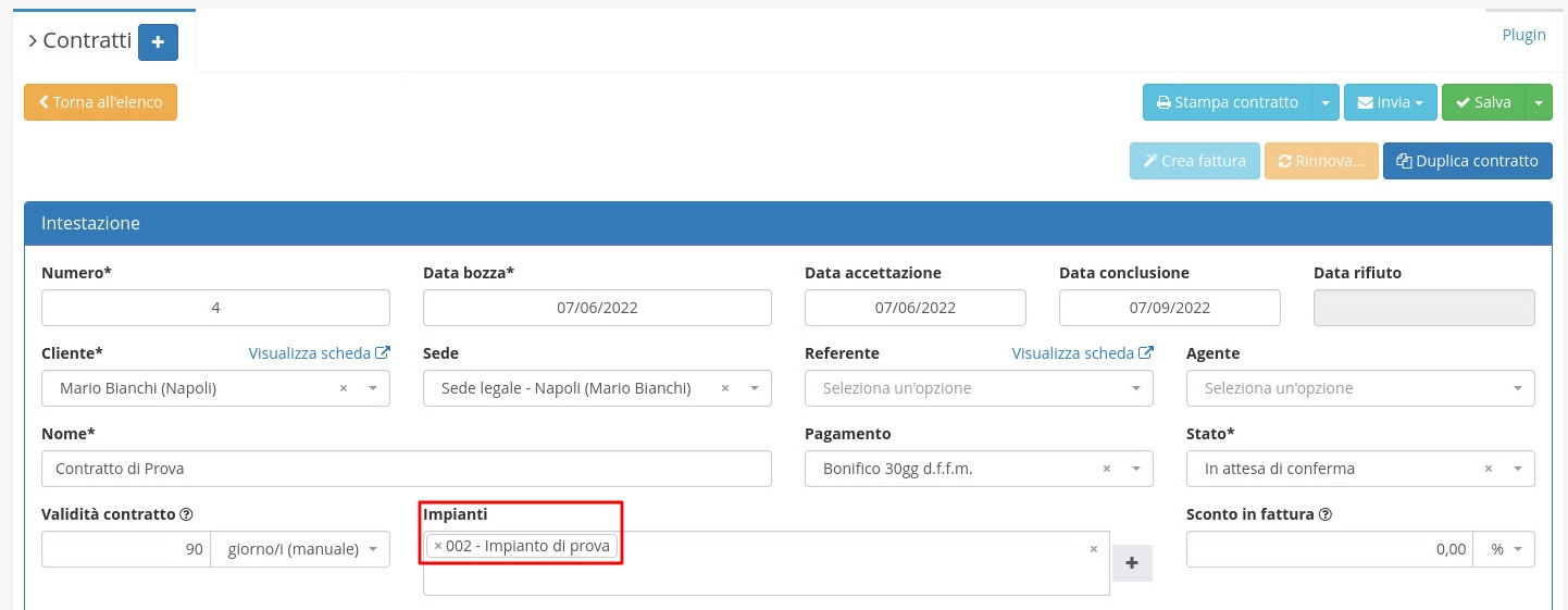 Dopo aver compilato tutti i campi richiesti si andrà a selezionare l'impianto interessato sotto la voce Impianti, creandone eventualmente uno al volo cliccando su (+).