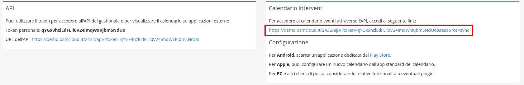 L'API corretto è quello nella sezione di destra: Calendario interventi. Copiando l'API nella sezione API (sinistra) la procedura non andrà a buon fine.