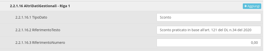 Da qui bisogna inserire nel campo Riferimento Testo la seguente dicitura: "Sconto praticato in base all'art. 121 del DL n.34 del 2020".