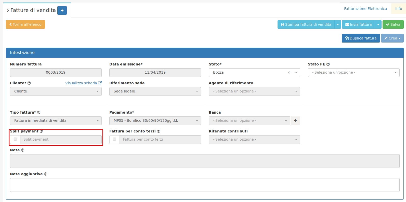 Creando una fattura di vendita è possibile abilitare lo split payment spuntando la casella sotto indicata.