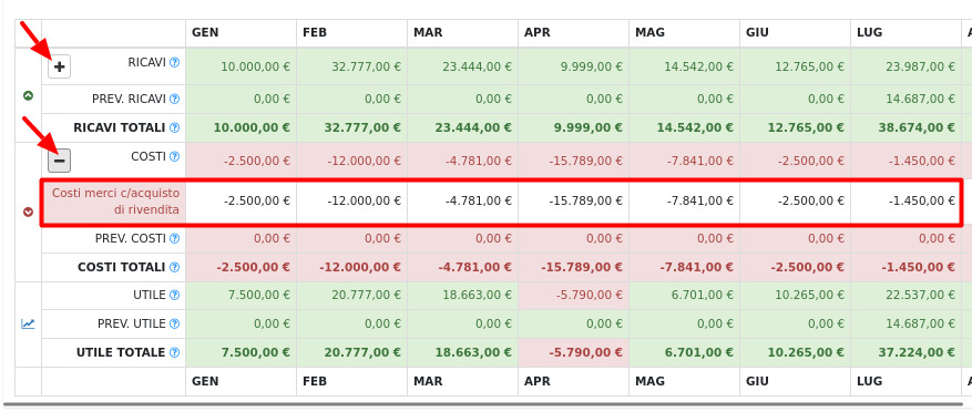 Inoltre, cliccando sul tasto "+" vicino a Ricavi e Costi, sarà possibile vedere la lista dei conti in cui ricavi e costi saranno rispettivamente imputati.