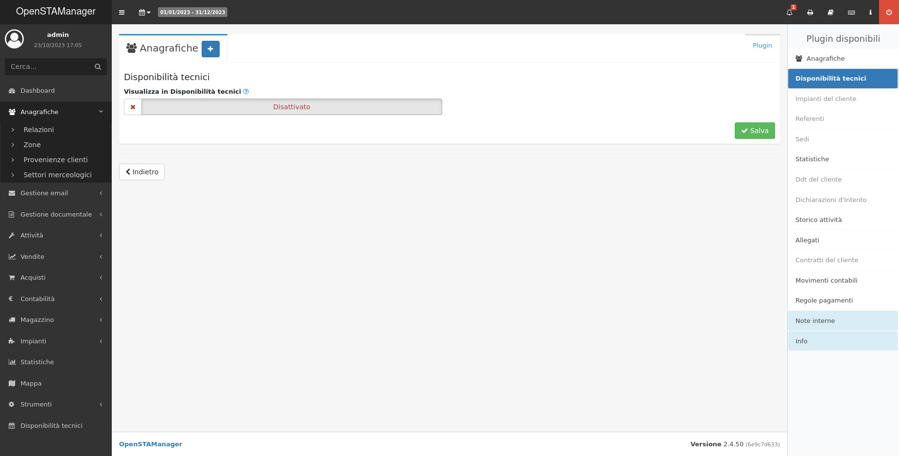 Nelle schede anagrafica di tipo tecnico è ora presente un plugin dal quale è possibile modificare la presenza di un tecnico nel modulo Disponibilità tecnici.