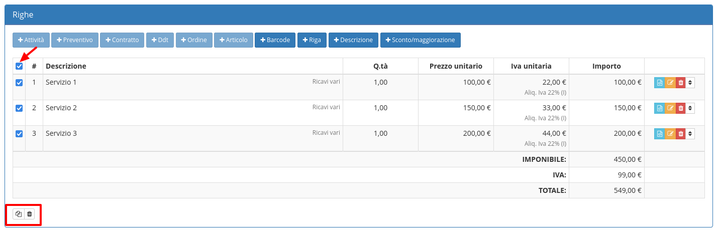 Per modificare le righe di un documento è possibile selezionare tutte le righe interessate e svolgere azioni di duplicazione o eliminazione massive.