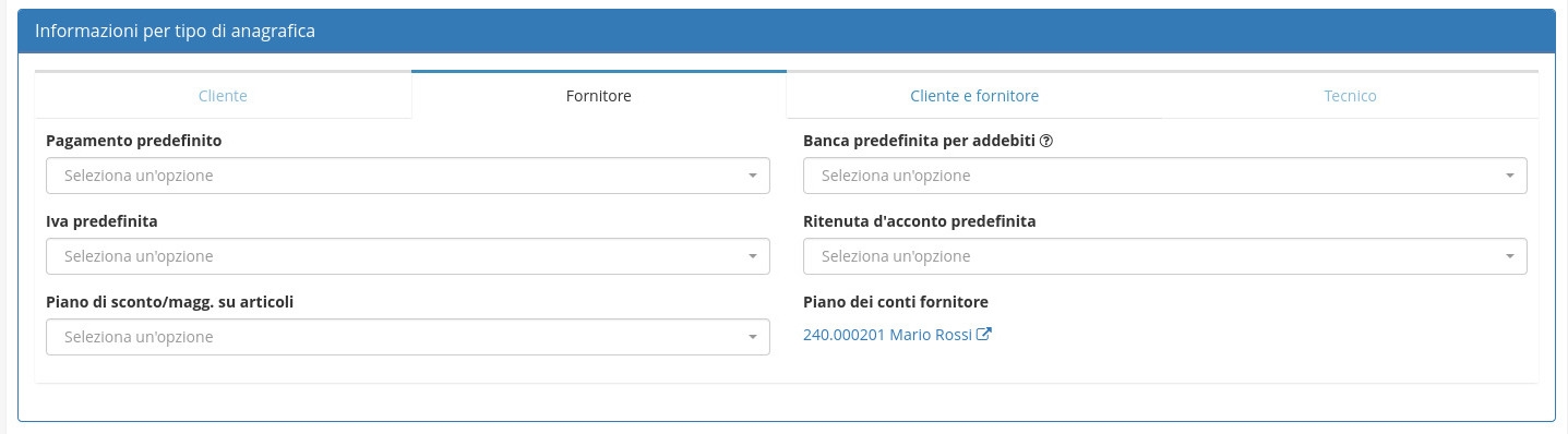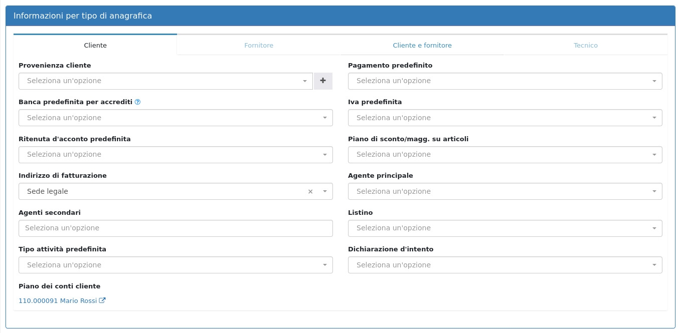 In questa sezione si possono impostare dei valori predefiniti in base al tipo di anagrafica:
