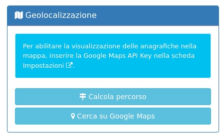 Andando a inserire questa chiave in Strumenti/Impostazioni/API/Google Maps API key, dall'anagrafica cliente sarà ora possibile visualizzare la sua locazione in Geolocalizzazione.