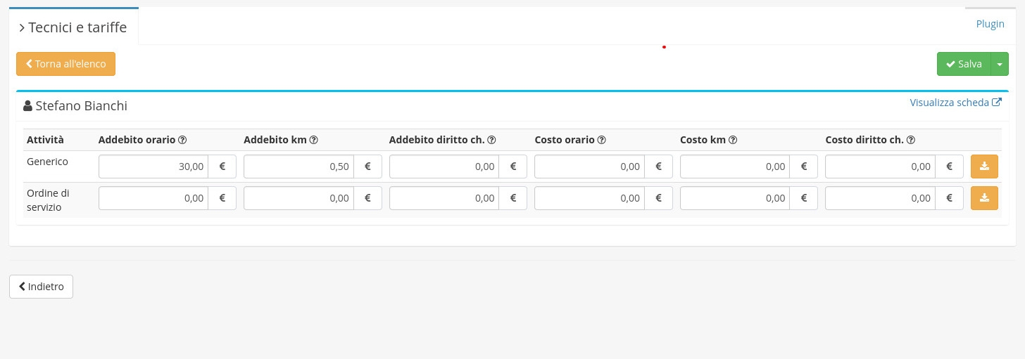 Cliccando sul record del tecnico di cui si vorranno modificare le tariffe, si aprirà la schermata di dettaglio, da cui sarà possibile modificare:
